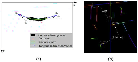 (a) Example of thinned curve using polynomial curve fitting and the corresponding derived endpoints and tangential direction vectors. (b) Example of thinning result using the proposed method (different line segments are marked with different colors; cases of overlap and gaps are pointed out).