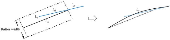 As shown in Figure 4, the proposed overlap optimization is motivated by the matching principle presented by Wiedemann []. Let and denote two different line segments. A buffer with constant width is then constructed around . The parts of located in the buffer are considered as the overlapping parts. The overlapping ratio can be computed by where are the lengths of within and without the buffer respectively. If the overlapping ratio is large than the given threshold , and will be merged into one line segments by polynomial curve fitting using the data points on the line segments and . The overlap optimization is finally implemented by repeating the above steps and constantly updating the line segments until there are no two line segments that satisfy the condition where is 0.5 in this article. In practice, the buffer width can be set according to the linear width feature map estmiated from