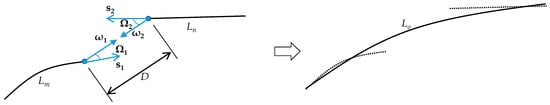 The continuity optimization is aimed at filling the gaps between line segments which have similar direction features. As illustrated in Figure 5, this procedure is ruled by two parameters: 1): the spatial Euclidean distances between endpoints that belong to the two target line segments using image coordinates; 2): the angle between tangential direction vectors and connected direction vectors at the endpoints where is defined as the vector from one endpoint to another endpoint. For two given line segments from the same image layer, the optimization is conducted if one of geometric constraint conditions below is satisfied: