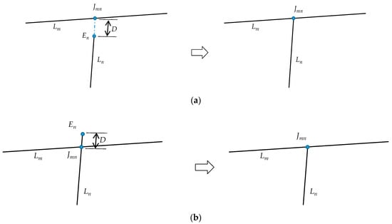 Road junctions, which usually appear as the shapes of “L”, “T”, and “十”, are significant parts in the road network. To resolve the gaps and burrs illustrated in Figure 6, a junction optimization method is proposed which can work well in the both cases. Let denote two line segments derived from different image layers, which means they have different direction features and may form a junction. In order to determine the cross point of , one direct method is solving the combined curve equations of . However, the solution will be complex and time-consuming when the equation order is high. Thus, the cross point is determined by searching the pixels located on the target curve. Suppose that is the pixel coordinate set of and is the curve equation of . Then, a potential cross point set can be determined by . If is not an empty set, the cross point is then determined by