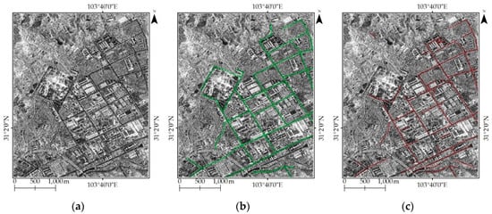 Road extraction results for study site 1. (a) Original SAR image; (b) reference road network; (c) extracted road network with proposed method.