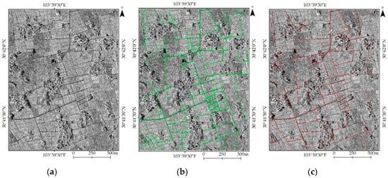 The experiments were conducted on high-resolution SAR images from two different satellite sensors, which are Radarsat-2 and TerraSAR-X. Table 1 lists the main characteristics of SAR images in experimental study sites. Study site 1 was collected from Radarsat-2 using ultrafine acquisition mode. Study site 1 is located in Dujiangyan, Sichuan, China, and covers an area of factories. Study site 2 lies in Chongzhou, Sichuan, southwest of China. It was acquired by TerraSAR-X sensor with staring spotlight mode and mainly contains road network and some villages. Study site 3 is a larger dataset located in Denver, Colorado, USA which includes more complex scenes such as cloverleaf junction, lakes, and a dense residential area. The original SAR images and geographic information are presented in Figure 7a, Figure 8a, and Figure 9a.
