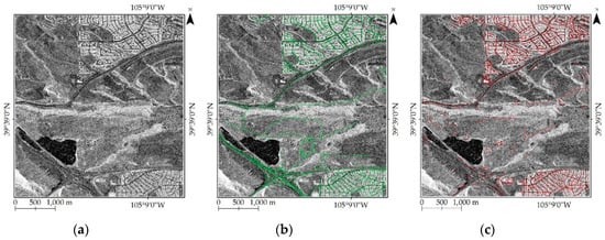 Road extraction results for study site 3. (a) Original SAR intensity image; (b) reference road network; (c) extracted road network with proposed method.