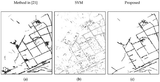 For road segmentation, the proposed method is compared with results from method in [] and method of SVM which uses LFR, backscattering , and CV as feature vector. Figure 10 presents the segmentation results using different methods in the three study sites. As shown in Table 3, the three method were also compared in terms of quantitative indexes. It should mentioned that all the quantitative indexes are computed using the same thinning method and parameters.