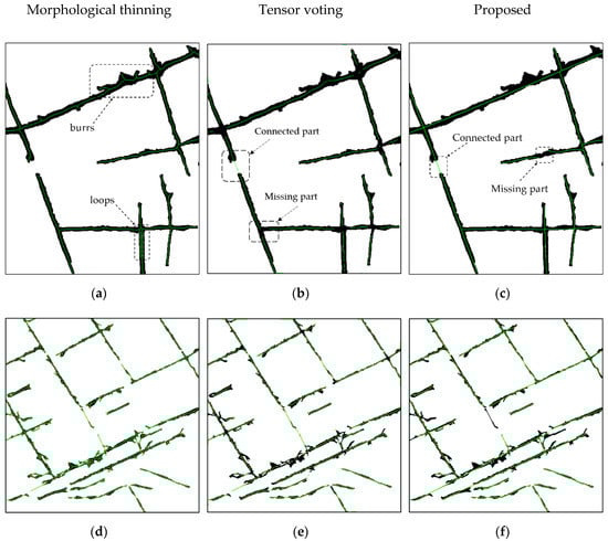 Comparison of network generation results with morphology thinning, tensor voting, and proposed method: (a–c) test image 1; (d–f) test image 2.