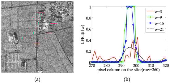 Concerning the multiplicative Duda operation, window size is the key parameter. Usually, the parameter must be chosen to obtain responses with high contrast between lines and non-lines. As shown in Figure 12a, an image slice which is marked in red and contains line pixels is selected. Figure 12b shows the line feature responses of selected pixels under different window widths, while the other parameters remain the same. It can be inferred that window width has an obvious influence on the detection results and the optimal should be equal to the actual pixel width of road in the image. Since road width is usually unknown in advance and it changes with different road types, windows with different widths should be applied and the maximum response value should be taken even though it may increase the cost of time.