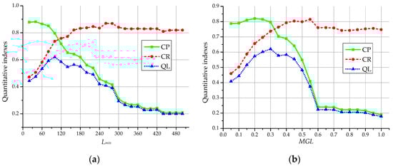 (a) The quantitative indexes (CP, CR, QL) versus the pixel length threshold while is fixed to 0.3; (b) the quantitative indexes versus while is fixed to 100.