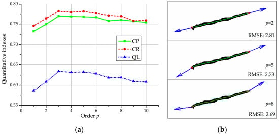 (a) The quantitative indexes (completeness, correctness, quality) versus the order in the case of study site 1; (b) results of polynomial curves fitting with different order on a connected component. (Green lines are fitting results, black connected-components are extracted road candidates, red points are extracted endpoints, and blue arrows represent tangential extension directions.).
