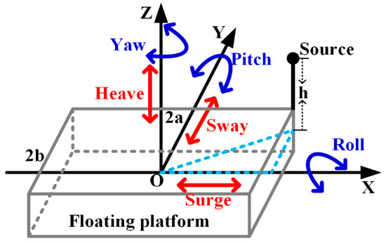 Due to the interaction between the ocean floating platform and complex ocean environment, based on the seakeeping theory of deep-water floating platform, the motion of the ocean floating platform can be viewed as the superposition of sway, surge, heave, yaw, pitch, and roll with a multi-frequency model [32,33]. Figure 1 shows the diagram of six DOF motion for a transmitting sensor on a floating platform. It is assumed that the source is at . According to the work of Walsh et al. in [27], the motion components in vertical direction will not result in additional Doppler effect. Thus, heave will not be considered in the physical model as well as the components of pitch and roll in vertical direction. The displacement vectors in horizontal direction caused by sway, surge, yaw, pitch, and roll can be respectively expressed as
