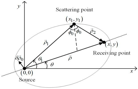 First-order bistatic high-frequency (HF) radar scatter geometry with antenna motion. , , and represent the source, the scattering point, and the receiving point, respectively. is the displacement vector caused by the source motion. is the angle between the -axis and the direction of the receiving point. is the angle between the -axis and the direction of the scattering point. is the displacement vector from the source to the receiving point. is the displacement vector from the source to the scattering point. is the displacement vector from the scattering point to the receiving point and indicates the bistatic angle.