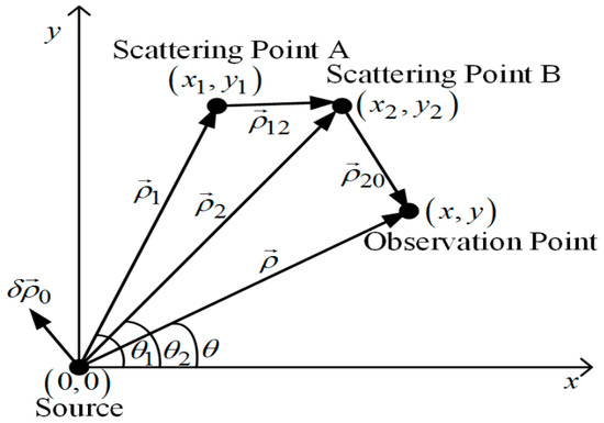 In general, the second-order RCS is mainly composed of two parts. One is due to single ocean surface scatter from a second-order ocean wave and the scatter geometry is similar to Figure 2. Its difference from the first-order RCS is that the first-order ocean wave at the scattering point is replaced by a second-order ocean wave. The other is due to double scatters from two first-order ocean waves and the scatter geometry is shown in Figure 3. In [31], Ma et al. derived the second-order bistatic HF RCS when the source is deployed on a floating platform with a single-frequency sway motion. Then, different platform motion models are introduced to derive corresponding second-order RCS [29,34]. In this study, based on the scattering theory in [31], a more realistic six DOF oscillation motion model is established and the second-order bistatic HF RCS model can be modified to