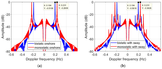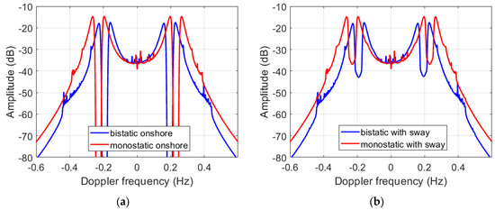 Simulated first-order radar cross sections (RCSs), (a) for onshore monostatic and bistatic cases; (b) for floating-based monostatic and bistatic cases with sway.