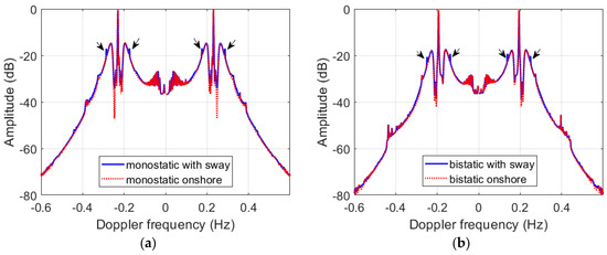 Simulated total RCSs containing first- and second-order RCSs, (a) for onshore and floating-based monostatic cases; (b) for onshore and floating-based bistatic cases. The black arrows represent additional sway-induced peaks.