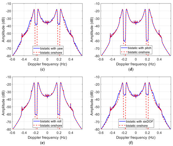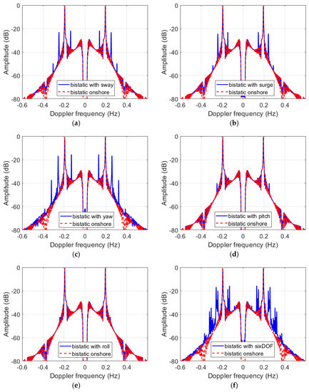 Figure 7 shows the simulated first-order RCSs for different platform motion models. It can be seen that each one-dimensional oscillation motion will induce additional peaks. The locations and amplitudes of these additional motion-induced peaks are different from each other, which are decided by the frequency and amplitude of corresponding oscillation motion, respectively. From Equation (47), the initial phase of each one-dimensional oscillation motion has no effect on RCSs. Therefore, the oscillation motion of the floating platform can be regarded as frequency modulation of RCS of the onshore bistatic HF radar. From Figure 7d,e, pitch and roll have a smaller effect on RCSs compared to other oscillation motions. This is because the oscillation amplitudes of pitch and roll are relatively small. However, yaw results in more additional peaks appearing in the first-order RCS curve with a small oscillation amplitude and the amplitudes of these yaw-induced peaks are higher with respect to other cases. This is because the radar antenna is generally installed at the edge of the platform (especially a ship) to reduce the electromagnetic effect of platform superstructures on radar Doppler spectra. In this study, the antenna is assumed to be deployed far from the center of rotation. Thus, a small oscillation amplitude of yaw may cause a large horizontal antenna displacement.