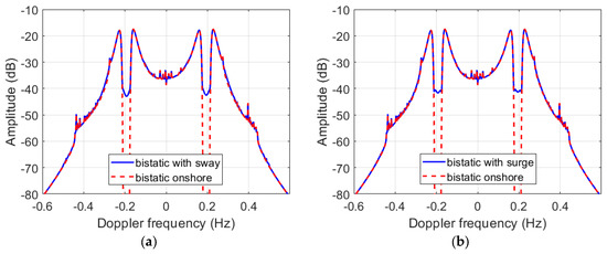 Comparisons of the RCSs for floating-based monostatic and bistatic radars with those for onshore monostatic and bistatic cases are shown in Figure 4, Figure 5 and Figure 6. It should be noted that only sway is considered in this part. From Figure 4a, the locations of the Bragg peaks of the onshore monostatic and bistatic HF radars are and , respectively. It is apparent that the locations of the Bragg peaks of the bistatic HF radar are closer to zero frequency and the amplitudes are lower than those of the monostatic case. This is because a term exists in Equation (47). From Figure 4b, it is seen that sway can result in some additional peaks symmetrically appearing in both monostatic and bistatic RCS curves. The amplitudes of these sway-induced peaks are generally lower than those of the Bragg peaks and the locations are respectively at and for the floating-based monostatic and bistatic cases. However, the locations of the Bragg peaks remain unchanged and the amplitudes are slightly lower than those of onshore cases.