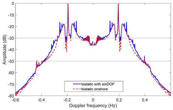 Figure 9 displays the simulated total RCS containing the first- and second-order RCSs for the bistatic HF radar incorporating a single-frequency six DOF oscillation motion model. From Figure 9, it is seen that the motion-induced peaks appearing in the first-order RCS curve will overlap with the second-order RCS curve and, then, the amplitude of the second-order RCS may be raised. For such a case, the amplitudes of the Bragg peaks are still larger than those of the motion-induced peaks. Compared to the sway case in Figure 6b, more motion-induced peaks with larger amplitude appear in the total RCS curve. Therefore, in practice, just considering one- or two-dimensional oscillation motion is not realistic.