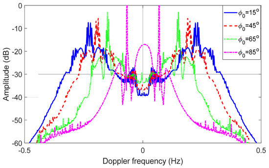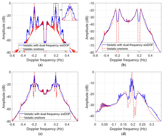 Figure 11 shows the simulated total RCSs containing the first- and second-order RCSs for different bistatic angles. It is obvious that the Bragg peaks, both the hydrodynamic and electromagnetic peaks for the second-order scatter and additional peaks caused by six DOF oscillation motion move closer to zero Doppler frequency while the bistatic angle is increasing. Furthermore, as the bistatic angle increases, the amplitudes of the second-order RCSs decrease, and the modulation effect caused by the platform motion is weakened. It should be noted that, from Equation (58), the second-order electromagnetic peaks may be far away from the Bragg peaks or even diminished from the total RCS curve for a large bistatic angle, for example as shown in Figure 11.