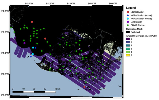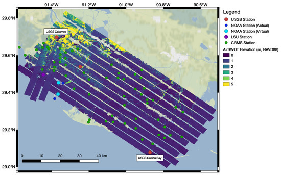 Figure 1 shows an overview map of the study area, with the locations of the in situ water level stations superimposed on a map of the calibrated AirSWOT elevation data, which should not be confused with a map of WSE. The map represents the elevation estimated from the AirSWOT interferometric phase, which is biased compared to the true WSE in vegetated areas. In order to estimate WSE from the AirSWOT elevation products, additional filtering and averaging is required (Section 3.2). The stations are colored according to their source. The two stations used as GCPs for AirSWOT calibration (Calumet and Caillou Bay) are annotated with their names. We chose to use Calumet and Caillou Bay as the calibration stations because they are located near the corners of the study area and are representative of the high and low ends of the observed water level range, respectively.