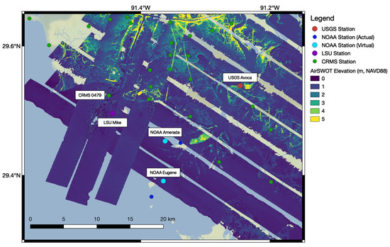 We used in situ water level measurements to calibrate and validate the AirSWOT estimates. Several stations within the study regions are managed by the United States Geological Survey (USGS), the National Oceanic and Atmospheric Administration (NOAA), and the Coastwide Reference Monitoring System (CRMS) [41]. These organizations publicly distribute their data online. We also used a Louisiana State University (LSU) dataset of in situ water level collected within the Wax Lake Delta, on Mike Island. A summary of the USGS, NOAA, CRMS, and LSU water level stations used in this study are shown in Table 2. In the table, the first two stations (Calumet and Caillou Bay) were used in the AirSWOT calibration procedure (Section 3.1). The remaining stations were used as independent validation of the AirSWOT water level estimates. In the table, the approximate geographic position of each station is listed.