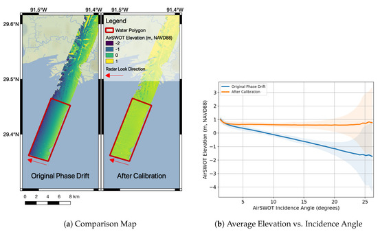 Comparison of AirSWOT elevation before and after applying our calibration method. Figure 3a shows maps of AirSWOT elevations using the original phase drift parameters (left map) and after applying our calibration method (right map). Figure 3b shows AirSWOT elevation vs. incidence angle for the water polygons (red boxes) in Figure 3a. The solid lines show the mean AirSWOT elevation at each incidence angle, while the shaded region shows around the mean. After our calibration procedure, the anomalous cross-track slope seen in the original results has been corrected.