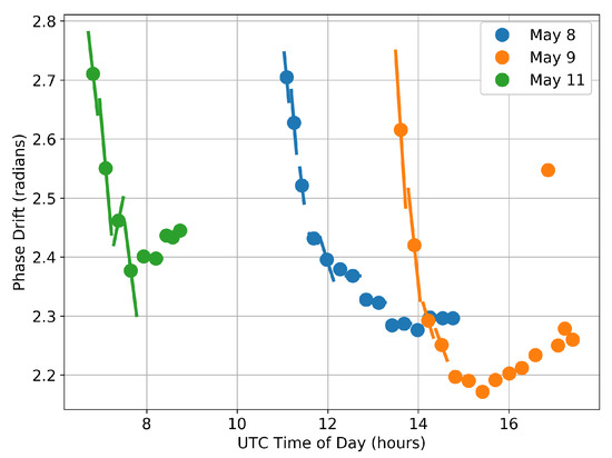 Phase drifts estimated by our calibration procedure for each day of the AirSWOT campaign. Early in each flight the estimated phase bias changes rapidly, but becomes more stable over time.
