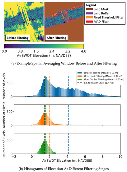 An example showing how the AirSWOT data is filtered, and the importance of these various filtering steps, is shown in Figure 6. Figure 6a shows the elevation of the AirSWOT pixels within the averaging window before (left) and after (right) filtering, while Figure 6b shows the distribution of the pixel-level AirSWOT elevations before filtering (in orange), after land and land buffer filtering (in green), and after outlier filtering (in blue). Bridges and power lines crossing the Wax Lake Outlet river channel are clearly seen in the data, and hinder accurate estimation of WSE around the Calumet station. These were successfully removed by our filtering method. In the right image of Figure 6a, the brown and purple pixels were removed by the land and 10 m land buffer masks, respectively. The orange and red pixels were removed by the fixed ± 3 m threshold and MAD outlier filtering, respectively. The fact that most of the red and orange pixels are near the edges of the land mask suggests they are affected by layover from the nearby land areas which is consistent with the AirSWOT look direction (toward the top left of the image). The layover results from several targets being at the same distance from the radar instrument, effectively combining vegetation and water surface measurements into the same radar pixel [14].