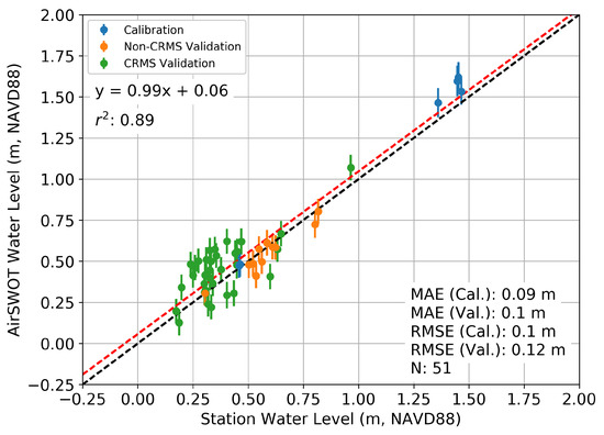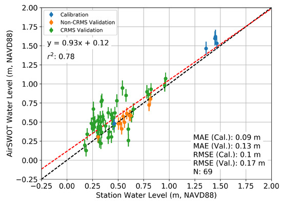 We found that limiting our analysis of CRMS stations to those located at AirSWOT incidence angles of less than 15 significantly decreased the uncertainty as shown in Figure 9. The MAE decreased to 10 cm, with RMSE of 12 cm. This is only 1–2 cm larger than the uncertainty of the calibration stations. A linear fit applied to all station types has equation with , showing strong agreement between AirSWOT and in situ WSE. We did not restrict the incidence angle of the non-CRMS validation stations because these stations showed less of an elevation error vs. incidence angle trend, and the non-CRMS stations are more limited in number than the CRMS stations.
