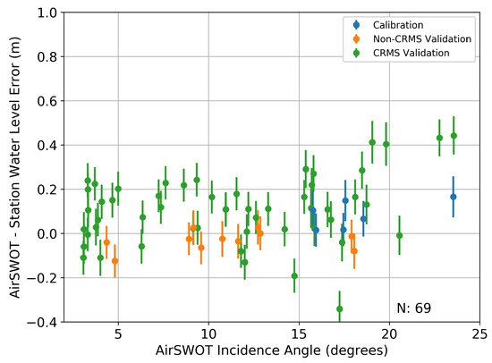 The MAE for all validation stations was 13 cm (RMSE of 17 cm), with the largest errors observed for some of the CRMS stations. The uncertainty calculated using only non-CRMS validation stations is 4 and 5 cm for MAE and RMSE, respectively. We determined the largest errors occur at higher AirSWOT incidence angles (Figure 8). Above incidence angles of about 15, errors increase for the CRMS and calibration stations. The non-CRMS stations show smaller errors than the CRMS stations, and also appear to be less affected by incidence angle, though one calibration station at very far range does show a bias of 18 cm. One possible explanation for the correlation between elevation error and incidence angle is that the CRMS stations tend to be in areas with more vegetation, particularly emergent vegetation. Vegetation-related InSAR elevation biases are greater in magnitude at higher incidence angles [50,51]. CRMS stations also tend to be in areas with thinner river channels, which can make it more difficult to filter out areas contaminated by layover. Since there are fewer water pixels in the averaging window, any localized errors (such as layover) will tend to have a greater impact on the mean elevation of the pixels within the window, causing the MAD outlier filter to be less effective. In addition, errors in the AirSWOT phase calibration will result in larger elevation errors at far range than at near range, as increases with incidence angle [14].