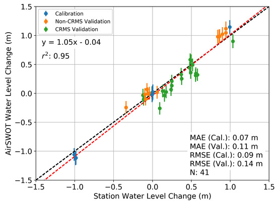 We assess the consistency of AirSWOT WSE measurements over time by looking at the relative change in WSE between repeat AirSWOT acquisitions. The results are shown in Figure 10. Change in WSE was calculated for all in situ water level stations observed at least twice. As in Figure 9, we excluded CRMS stations observed at AirSWOT incidence angles ≥15. The MAE of the WSE change estimates is slightly greater than the instantaneous WSE measurements—MAE of 11 cm and RMSE of 14 cm. The linear fit including all stations was found to be with , showing good agreement between AirSWOT and in situ.