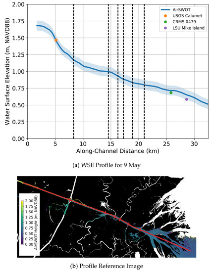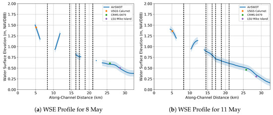 These WSS errors are significantly smaller than those reported in previous studies using AirSWOT to measure WSS [27,28,29,30], which generally found WSS errors on the order of 1.0 cm/km. However, we note that while those previous studies calculated WSS over 10 km reaches, here we calculate the slope between the USGS station at Calumet and the LSU Mike Island water level gauge, which are separated by almost 24 km. Unfortunately, we cannot accurately validate WSS over 10 km reaches of the Wax Lake Outlet due to the sparse coverage of the available in situ water level data in this location, as well as the void data caused by specular water on the 8 May and 11 May flights.