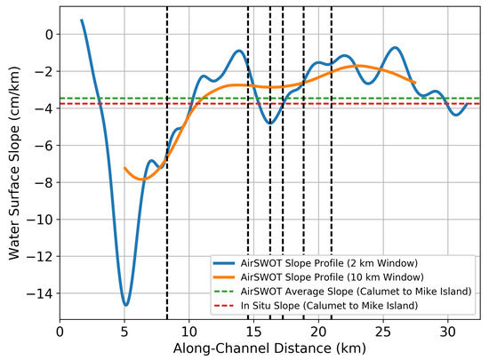 One main advantage of AirSWOT or other remote sensing techniques compared to in situ data is the spatial continuity of the WSE and WSS estimates. In addition to deriving an average WSS between stations, AirSWOT can produce a profile of WSE and WSS along a river channel, in particular when there are no “dark water” issues. A WSS profile for the 9 May data is shown in Figure 13. The blue line shows WSS estimated using a first order Savitzky-Golay filter with a 2 km moving window, the same window size used to produce the WSE profiles. We also produced a WSS profile using a 10 km moving window, to match the 10 km reach length used in other AirSWOT studies [27,28,29,30]. The WSS profiles do not extend to the full length of the WSE profiles due to the length of the Savitzky-Golay filter.