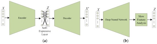 Deep networks in related works. (a) Deep subspace clustering []. (b) Deep slow feature analysis [].