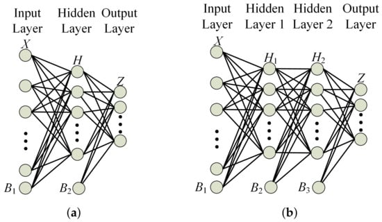 where denotes the weight matrix of the output layer, is the bias and g denotes the activation function. Finally, the weights of the AE-like network are learned by minimizing the target loss with the backpropagation algorithm. The so-called representation of the input data is the hidden layer. Generally, as the number of layers increases, the learning features are more abstract and more robust. The encoder with a different number of hidden layers are shown in Figure 3.