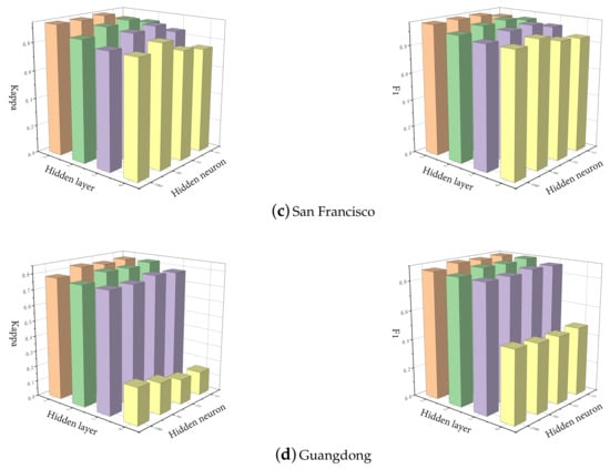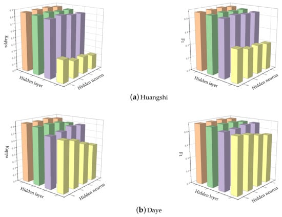 We argue that the number of hidden layers and the number of hidden neurons interact with each other. To choose the parameters of the network, we adopt a grid search method to avoid blindness and randomness, i.e., the number of hidden layers and the number of hidden neurons . The weights in the loss function are . The results are evaluated by Kappa and .