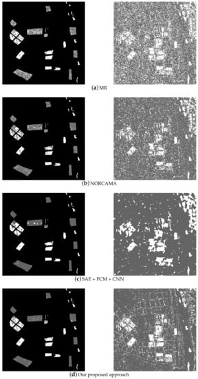 The change detection maps are shown in Figure 6, Figure 7, Figure 8 and Figure 9 and the quantitative metrics are presented in Table 6, Table 7, Table 8 and Table 9. From the results, we can find that the classic MR has noisy detection results and the corresponding detection accuracy is lower than other approaches. NORCAMA with the help of pre-denoising operation yields less noisy detection results, however, its detection accuracy is highly depending on the pre-denoising performance. SAE + FCM + CNN achieves a balance between the precision and the recall, which has less noise than the classic MR. However, it heavily relies on the pseudo labels, which may make the final detection accuracy very low when the pre-detection/classification results are poor. The edges of the detection results are very indistinct. Generally, our DDSR network outperforms the reference methods with higher detection accuracy, smooth detection results and clear edges.