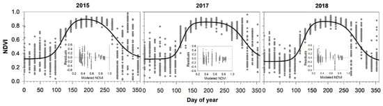 Annually, NDVI showed a bell-shaped pattern with a slow increase in spring, followed by a rapid increase and culmination in July and a decrease in autumn until reaching a minimum value in winter (Figure 2). On average, NDVI ranged from 0.32 in winter and spring to 0.9 in summer. The double-logistic function represented NDVI well during the whole season, including the asymmetry in the transitions between spring, summer and autumn. The satisfactory fitting was confirmed by the analysis of the residuals, which were uniformly distributed around zero for the three studied years. Only 3% of the residuals exceeded the range between −0.2 and 0.2, confirming the model reliability (Figure 2).