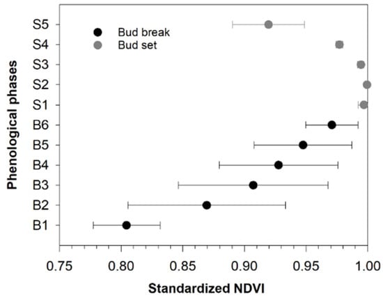 Our study assesses the explicit link between satellite imagery and phenological events recorded in the field [,]. We observed a quick increase in NDVI during the bud break process from mid-May to the end of June and a slow decrease in NDVI during the bud set phases from July to October. The punctual phases of bud break were identified along the continuous process of gradual variation in greenness. The variability in NDVI at bud set was lower than that at bud break because NDVI was close to its maximum when bud set was already occurring. By comparing bud phenological phases with NDVI curves, the peak standardized NDVI occurred at S2. It was observed four weeks and one after the completion of bud burst and the start of bud set, respectively. This increase in NDVI could be related to changes in needle biomass resulting from a gradual increase during bud burst phases and shoot elongation during spring and summer. Furthermore, leaf expansion, i.e., increment in leaf length and width during spring, is relatively rapid due to the transition from dormancy to active photosynthesis [,,].