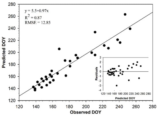 Relationship between observed DOY and simulated DOY in three years. The black line is the regression line between the observed DOY and the simulated DOY. The small panel shows the distribution of the residuals.