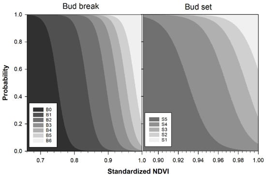 S1–S3 showed the highest probability of being observed at values between 0.97 and 1. In autumn, S4 culminated at of 0.95. At < 0.93, S5 exceeded S4, indicating that the buds were more likely to be dormant. Consequently, the bud set process was considered complete when was below 0.9 (Figure 5).