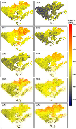 The dates of bud break (B1) were not homogenous across the study area (Figure 6). It generally occurred earlier in the southwestern region (end of April to May) and later in the northeastern region (mid to end of June), with the larger variations observed along the longitudinal gradient. Overall, the earliest and latest bud break dates were observed in 2010 (DOY 165) and 2012 (DOY 180), respectively. The highest spatial heterogeneity in bud break dates across the study area was observed in 2012, as shown by the large variances in Table 2. Bud break was more homogenous in 2013. The earliest bud break occurred in the last week of April (DOY 115–120) during 2010, 2012 and 2013.