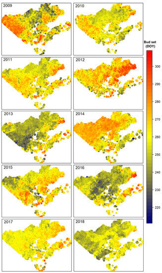 On average, bud set (S5) started at the beginning of August (DOY 215) and ended at the end of October (DOY 303) (Figure 7). The spatial pattern of bud set was not constant and no clear trend could be found among years. Late bud set occurred more frequently in western regions, mainly in 2009 and 2014. When comparing the years, the bud set date was more homogeneous across the study area in 2017 and more heterogeneous in 2009 (Table 2). The earliest bud set were estimated in 2013, 2016, and 2018. The range between the first and last bud break was 51 days, which is almost half the range observed in bud set (87 days). Therefore, the spatial pattern of the growing season length seems to be dominated by bud set. The longest growing seasons were observed in 2012 and 2014, while the shortest ones were observed in 2013 and 2016. The southwestern and central-eastern regions showed the longest growing seasons, while the shortest were detected in the north-central region of the study area.