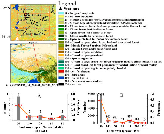 Location and land cover types of the study area and in-situ sites in Naqu on the Tibetan Plateau. A: histogram of land cover types at the locations of in-situ SM measurements in Pixel 1; B: histogram of land cover types of Pixel 1 with 25 km × 25 km; land cover based on the GLOBCOVER 2009 map at 300 m × 300 m spatial resolution.
