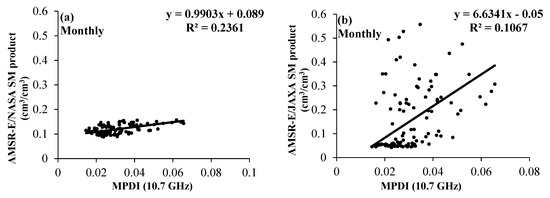 Relationships between the monthly AMSR-E/NASA and JAXA SM values and monthly MPDI in the Naqu area of the Tibetan Plateau in 2011: (a) NASA SM, all pixels; (b) JAXA SM, all pixels.