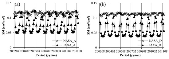 Both the AMSR-E/NASA and the AMSR-E/JAXA SM data are daily from 2002 to 2011 with 25 km × 25 km resolution. The mean value obtained with the AMSR-E/NASA SM is almost constant with a value of 0.12 in Figure 5a,b. The intra-annual amplitude is very small and also almost constant through the years. AMSR-E/JAXA SM changes with the season as a sine or cosine function, with a mean value of 0.08 cm3/cm3 and an amplitude of 0.04 cm3/cm3. At times, the standard deviation of the AMSR-E/JAXA SM data is higher than that of the AMSR-E/NASA data, which implies a larger spatial variability in the response to the seasonality of hydrologic conditions. The standard deviation of the AMSR-E/NASA data remains close to 0.06 cm3/cm3 over time, while it changes with time and season in the AMSR-E/JAXA data with an average of 0.05 cm3/cm3 and an amplitude of 0.035 cm3/cm3 (Figure 5c,d). Therefore, the AMSR-E/JAXA SM data capture both the intra- and inter-annual variability better than the AMSR-E/NASA data. The AMSR-E/NASA SM has an unrealistically narrow dynamic range, given the hydrological conditions in the study area.