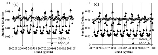 The monthly mean SM and standard deviation of AMSR-E/NASA and AMSR-E/JAXA retrievals for the same 2000 pixels for the Tibetan Plateau from 2002 to 2011: (a) SM retrieved with data collected during ascending orbits and (b) descending orbits; (c) SM standard deviation for ascending orbits, and (d) descending orbits.