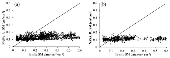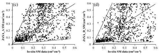The AMSR-E/NASA SM hardly changes with the in-situ SM (Figure 6a,b), i.e., the AMSR-E/NASA SM is insensitive to actual soil moisture conditions. The AMSR-E/NASA SM is always smaller than 0.2 cm3 cm−3 during both ascending and descending orbits. Contrariwise, the spatial SM dynamic range of in-situ SM measurements is from 0 to 0.6 cm3 cm−3. Therefore, the SM dynamic range of the AMSR-E/NASA SM is inconsistent with the in-situ SM measurements. Compared to the AMSR-E/NASA SM product, the spatial SM dynamic range of AMSR-E/JAXA SM is larger, from 0 to 0.6 cm3 cm−3 (Figure 6c,d).