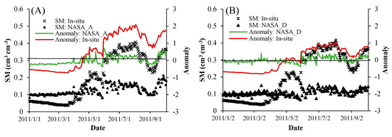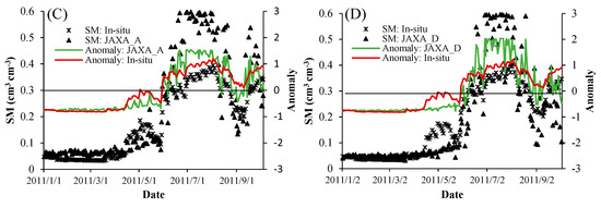 Intra-annual variation and relative anomaly of AMSR-E/NASA, JAXA SM data and in-situ SM measurements in Pixel 1, 2011: (A) AMSR-E/NASA during ascending orbits and (B) descending orbits; (C) AMSR-E/JAXA during ascending orbits, and (D) descending orbits.