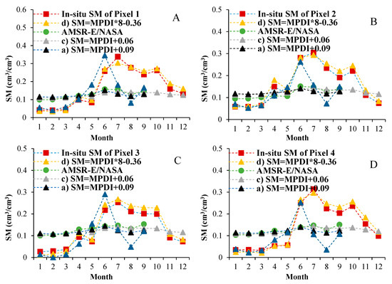 We used the in-situ SM data in Pixel 1, Pixel 2, Pixel 3, and Pixel 4, where we had most of our measurements, to analyze the relationship with MPDI (Figure 8). By fitting Equation (12) to both the AMSR-E/NASA and the in-situ SM data, we estimated the parameters A0 and A1 and further retrieved four sets of SM data (Figure 8). As regards the AMSR-E/NASA SM data, the A0 and A1 values were approximately the same in all pixels and equal to 1 and 0.06, respectively. As regards the in-situ data, however, we obtained A1 = 8. In other words, the value of A1 obtained by fitting Equation (12) to the AMSR-E/NASA SM product is too small and it explains the very small dynamic range. Accordingly, the model SM = 8*MPDI-0.36, i.e., (A0, A1) values obtained with the RTM MPDI + in-situ SM data (Table 1), is expected to perform better when applied to retrieve SM in our study area.