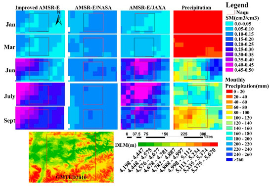 Spatial and temporal comparison of the monthly AMSR-E/NASA, AMSR-E/JAXA, I_AMSR-E SM and precipitation in January, March, June, July and September in 2011, the Naqu area (upper panel); Digital Elevation Model (DEM, lower panel).