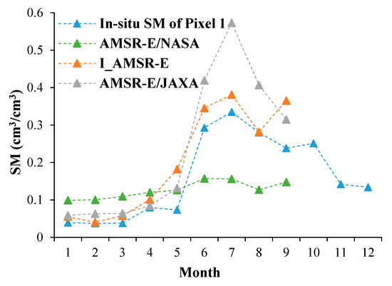 The temporal variability between AMSR-E/JAXA SM and in-situ measurements is similar, while the one of the AMSR-E/NASA SM is very different in all pixels. In this study, the in-situ measurements in Pixel 1 were used to illustrate the difference of temporal variability between AMSR-E/NASA SM and in-situ measurements (Figure 7). The in-situ measurements show that the SM content was very low in this area from January to April, i.e., less than 0.15 cm3 cm−3. Since April, SM increased gradually. The first small peak in SM appeared in May. This may be due to the melting of frozen soil as the temperature increased. The highest SM content was from June to August, and maximum SM was about 0.4 cm3 cm−3. The AMSR-E/JAXA SM largely overestimated the in-situ SM, especially from July to August, while underestimating the in-situ SM from January to April; AMSR-E/JAXA SM was more consistent with in-situ SM data. The AMSR-E/NASA SM slightly changes with time. The range of AMSR-E/NASA SM is from 0.05 to 0.20 cm3 cm−3.